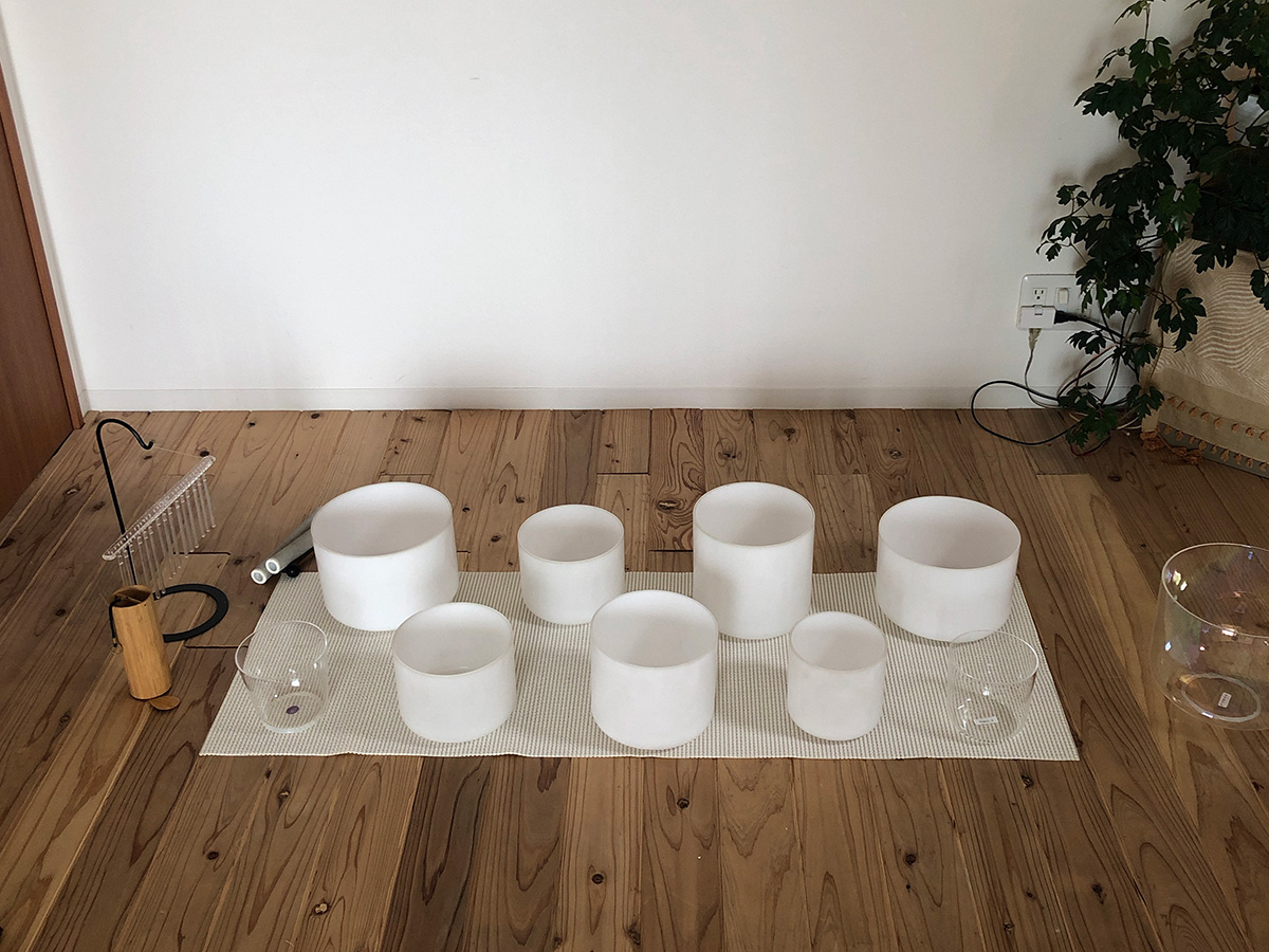 ソルフェジオ周波数の響きを持ったクリスタルボウルを中心に、複数のボウルで演奏を作っています。