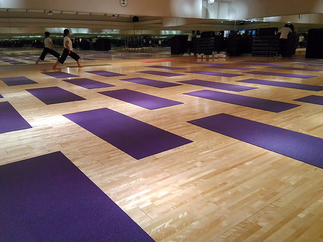 会場のフィットネススタジオはとても広い空間。40枚のヨガマットが丁寧に敷かれていきます。